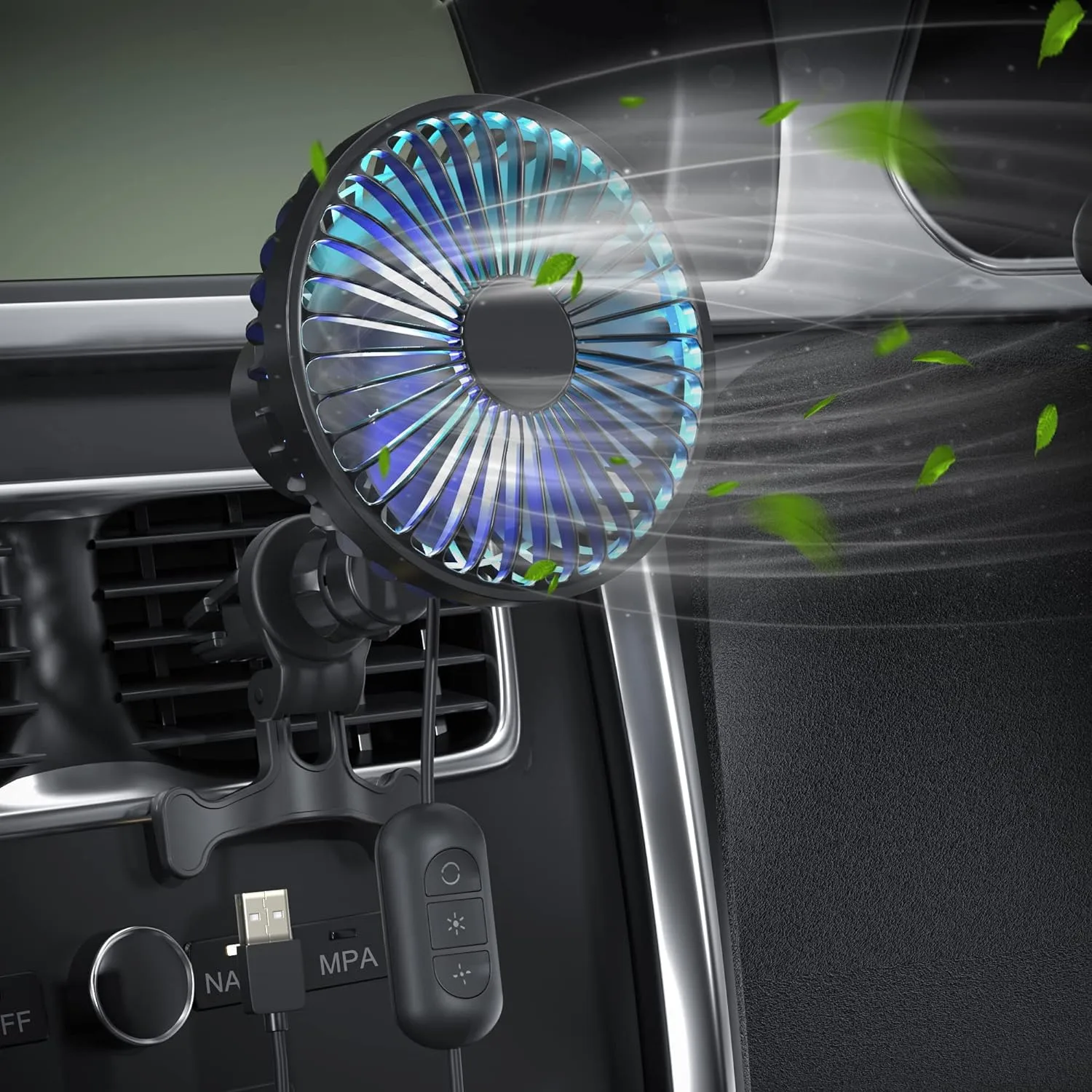 Equipped with cool colorful LED lights for enhanced night vision and a 360° rotatable joint ball, this USB car fan allows you to direct the airflow precisely where you need it most. Powered by USB, it’s compatible with car chargers, power banks, and other USB-enabled devices, making it versatile and convenient for use on the go. Plus, its universal fit ensures compatibility with most car vents, whether vertical or horizontal, making it suitable for a wide range of vehicles, from SUVs to sedans.